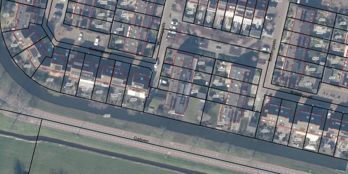 Het perceel waarop Buitengaats 42 staat heeft een oppervlakte van 216 m². Dit is een middelgroot perceel. De perceeloppervlakte wordt geregistreerd door het Kadaster. Gedetailleerde informatie over de maten van dit perceel kunt u vinden in het rapport Kadastrale kaart met maatvoering van Buitengaats 42.