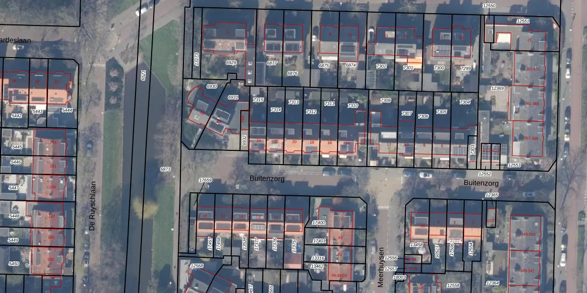 Het perceel waarop Buitenzorg 20 staat heeft een oppervlakte van 157 m². Dit is een middelgroot perceel. De perceeloppervlakte wordt geregistreerd door het Kadaster. Gedetailleerde informatie over de maten van dit perceel kunt u vinden in het rapport Kadastrale kaart met maatvoering van Buitenzorg 20.