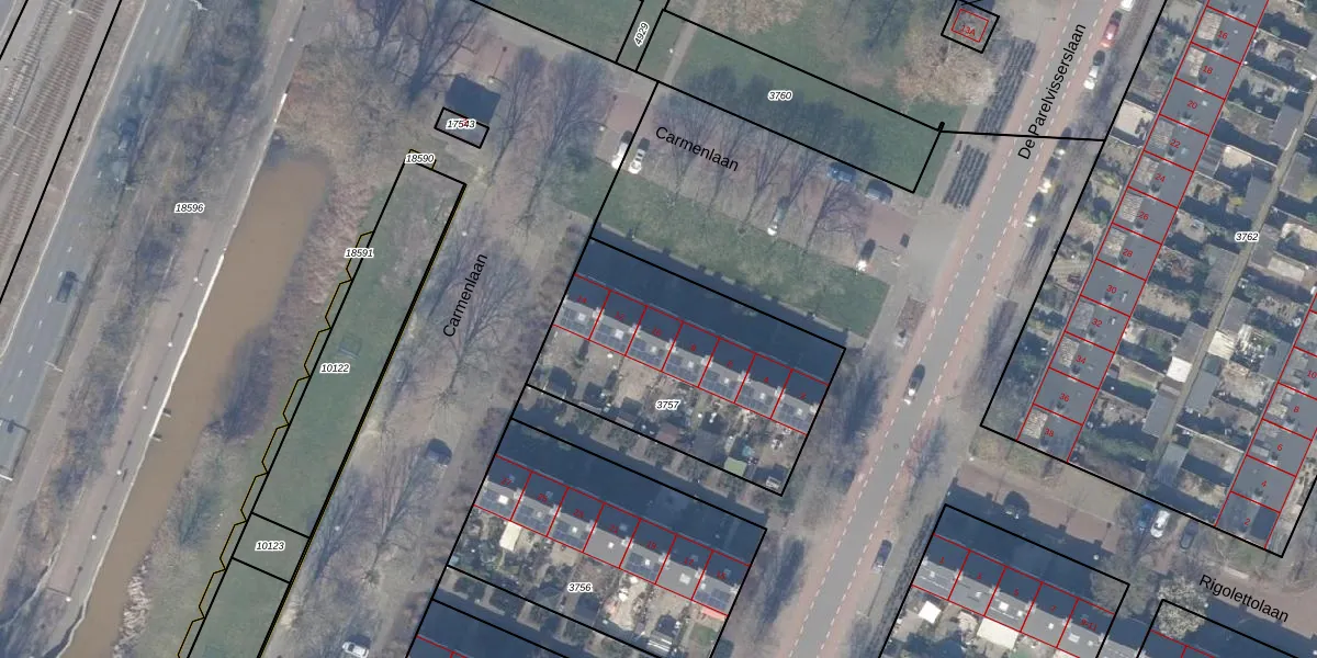 Carmenlaan 10 is gelegen op kadastraal perceel ASV00I3757. Deze kadastrale aanduiding is uniek en wordt gebruikt door het Kadaster om eigendomsrechten en andere zakelijke rechten vast te leggen. Het perceel maakt onderdeel uit van de kadastrale gemeente Amstelveen.