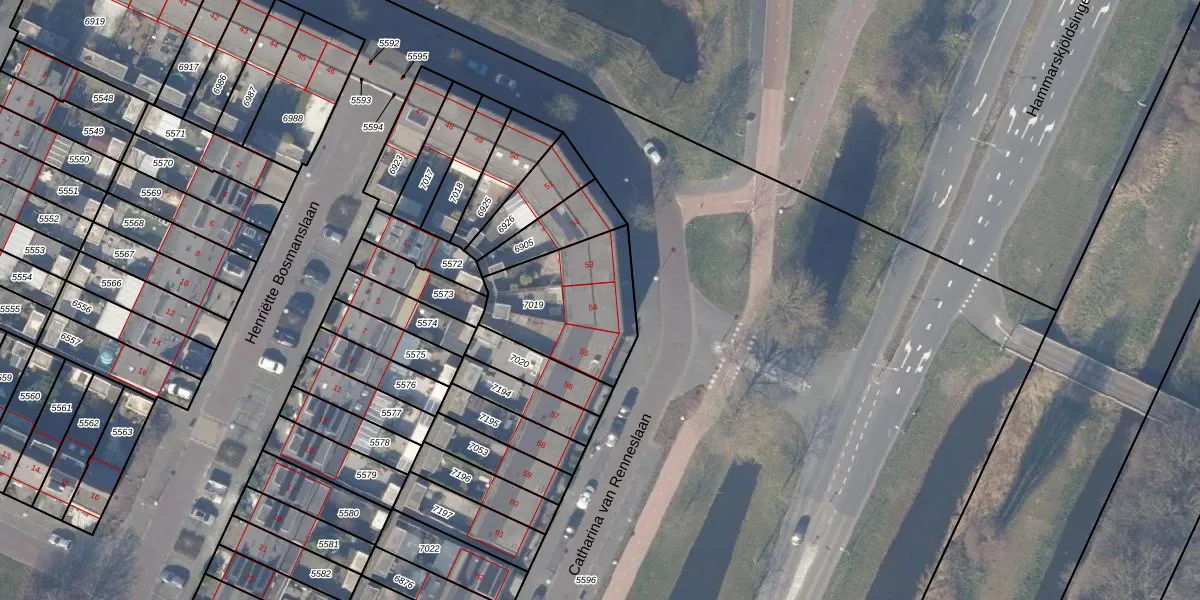 Catharina van Renneslaan 54 is gelegen op kadastraal perceel ASV00O7019. Deze kadastrale aanduiding is uniek en wordt gebruikt door het Kadaster om eigendomsrechten en andere zakelijke rechten vast te leggen. Het perceel maakt onderdeel uit van de kadastrale gemeente Amstelveen.
