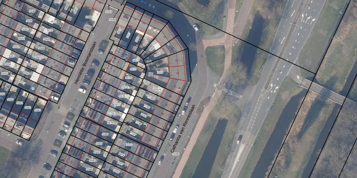 Het perceel waarop Catharina van Renneslaan 55 staat heeft een oppervlakte van 450 m². Dit is een groot perceel. De perceeloppervlakte wordt geregistreerd door het Kadaster. Gedetailleerde informatie over de maten van dit perceel kunt u vinden in het rapport Kadastrale kaart met maatvoering van Catharina van Renneslaan 55.