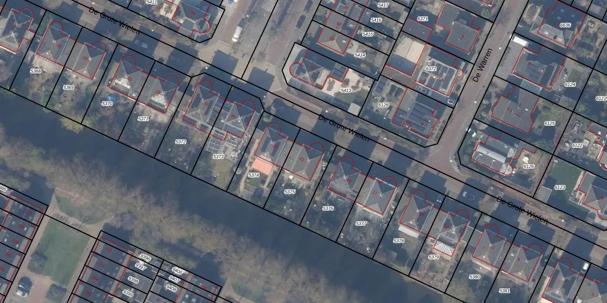 De Grote Wielen 21 is gelegen op kadastraal perceel ASV00O5375. Deze kadastrale aanduiding is uniek en wordt gebruikt door het Kadaster om eigendomsrechten en andere zakelijke rechten vast te leggen. Het perceel maakt onderdeel uit van de kadastrale gemeente Amstelveen.