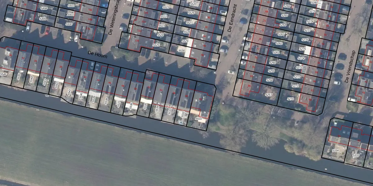 Het perceel waarop De Hoorn 58 staat heeft een oppervlakte van 173 m². Dit is een middelgroot perceel. De perceeloppervlakte wordt geregistreerd door het Kadaster. Gedetailleerde informatie over de maten van dit perceel kunt u vinden in het rapport Kadastrale kaart met maatvoering van De Hoorn 58.