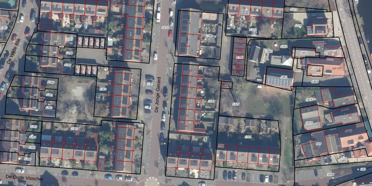 Het perceel waarop De Jonge Gerard 22 staat heeft een oppervlakte van 1568 m². Dit is een zeer groot perceel. De perceeloppervlakte wordt geregistreerd door het Kadaster. Gedetailleerde informatie over de maten van dit perceel kunt u vinden in het rapport Kadastrale kaart met maatvoering van De Jonge Gerard 22.