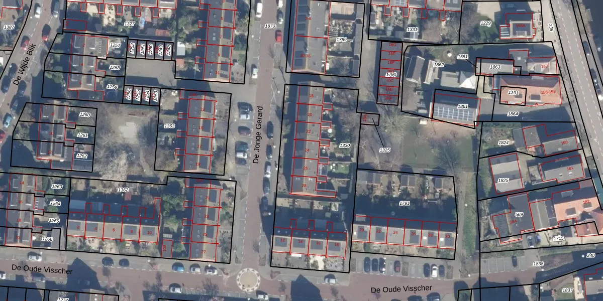 Het perceel waarop De Jonge Gerard 24 staat heeft een oppervlakte van 1568 m². Dit is een zeer groot perceel. De perceeloppervlakte wordt geregistreerd door het Kadaster. Gedetailleerde informatie over de maten van dit perceel kunt u vinden in het rapport Kadastrale kaart met maatvoering van De Jonge Gerard 24.