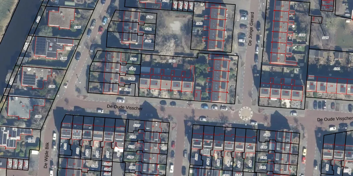 Het perceel waarop De Oude Visscher 8 staat heeft een oppervlakte van 1402 m². Dit is een zeer groot perceel. De perceeloppervlakte wordt geregistreerd door het Kadaster. Gedetailleerde informatie over de maten van dit perceel kunt u vinden in het rapport Kadastrale kaart met maatvoering van De Oude Visscher 8.