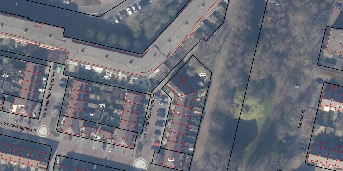 De Weteringsbrugmolen 1 is gelegen op kadastraal perceel ASV00M5681. Deze kadastrale aanduiding is uniek en wordt gebruikt door het Kadaster om eigendomsrechten en andere zakelijke rechten vast te leggen. Het perceel maakt onderdeel uit van de kadastrale gemeente Amstelveen.