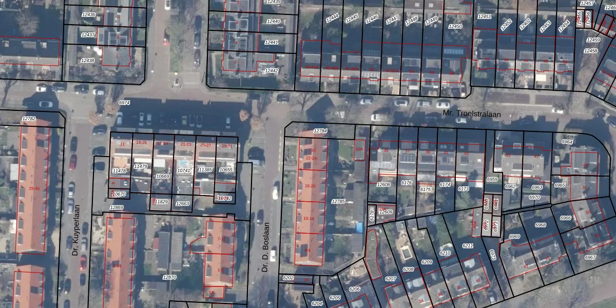 Het perceel waarop Dr. D. Boslaan 22 staat heeft een oppervlakte van 1226 m². Dit is een zeer groot perceel. De perceeloppervlakte wordt geregistreerd door het Kadaster. Gedetailleerde informatie over de maten van dit perceel kunt u vinden in het rapport Kadastrale kaart met maatvoering van Dr. D. Boslaan 22.