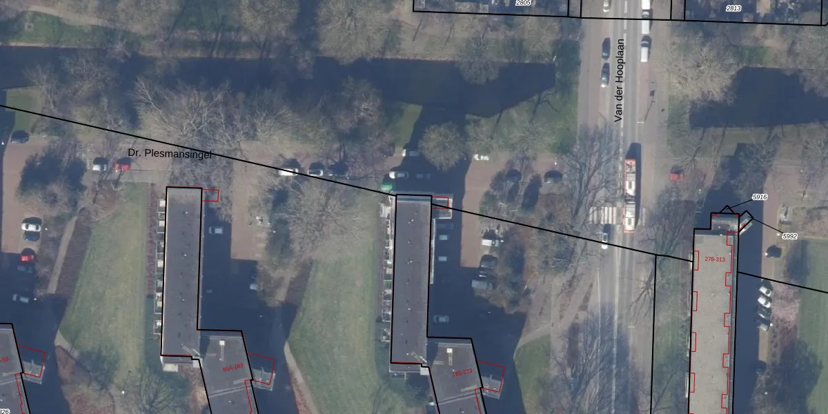 Dr. Plesmansingel 185 is gelegen op kadastraal perceel ASV00M2324. Deze kadastrale aanduiding is uniek en wordt gebruikt door het Kadaster om eigendomsrechten en andere zakelijke rechten vast te leggen. Het perceel maakt onderdeel uit van de kadastrale gemeente Amstelveen.