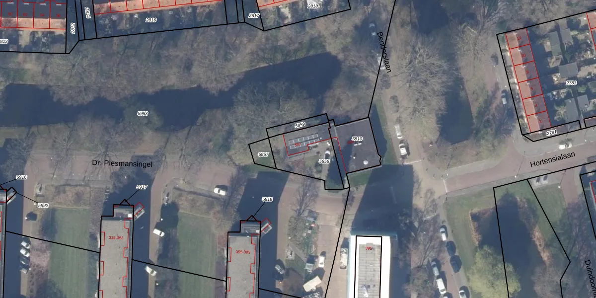 Dr. Plesmansingel 392 is gelegen op kadastraal perceel ASV00M5858. Deze kadastrale aanduiding is uniek en wordt gebruikt door het Kadaster om eigendomsrechten en andere zakelijke rechten vast te leggen. Het perceel maakt onderdeel uit van de kadastrale gemeente Amstelveen.