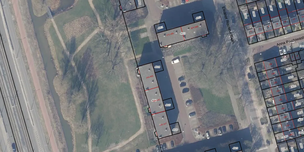 Eleanor Rooseveltlaan 155 is gelegen op kadastraal perceel ASV00I4917. Deze kadastrale aanduiding is uniek en wordt gebruikt door het Kadaster om eigendomsrechten en andere zakelijke rechten vast te leggen. Het perceel maakt onderdeel uit van de kadastrale gemeente Amstelveen.