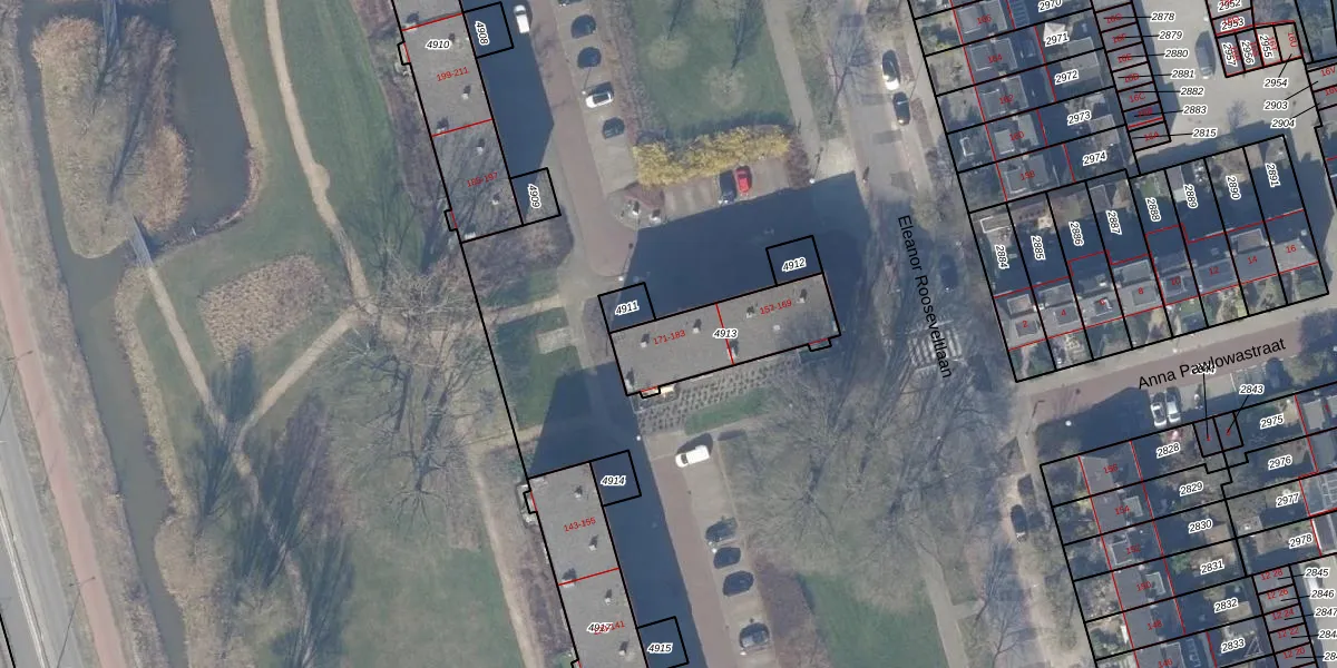Eleanor Rooseveltlaan 183 is gelegen op kadastraal perceel ASV00I4913. Deze kadastrale aanduiding is uniek en wordt gebruikt door het Kadaster om eigendomsrechten en andere zakelijke rechten vast te leggen. Het perceel maakt onderdeel uit van de kadastrale gemeente Amstelveen.