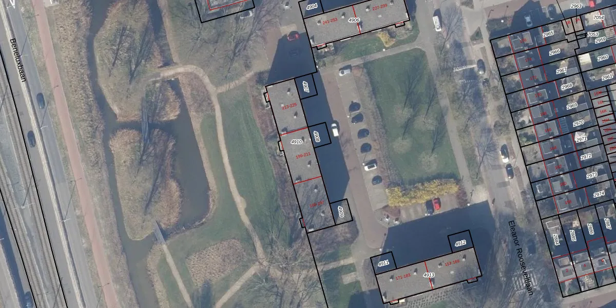 Eleanor Rooseveltlaan 211 is gelegen op kadastraal perceel ASV00I4910. Deze kadastrale aanduiding is uniek en wordt gebruikt door het Kadaster om eigendomsrechten en andere zakelijke rechten vast te leggen. Het perceel maakt onderdeel uit van de kadastrale gemeente Amstelveen.