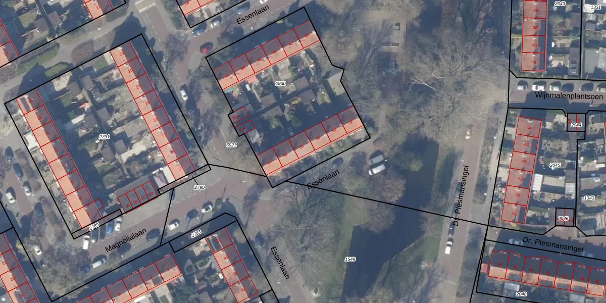 Het perceel waarop Essenlaan 56 staat heeft een oppervlakte van 1785 m². Dit is een zeer groot perceel. De perceeloppervlakte wordt geregistreerd door het Kadaster. Gedetailleerde informatie over de maten van dit perceel kunt u vinden in het rapport Kadastrale kaart met maatvoering van Essenlaan 56.