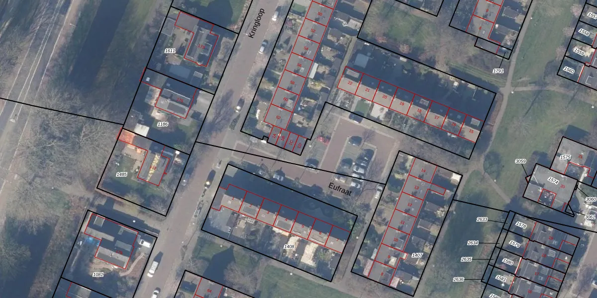 Het perceel waarop Eufraat 1-D staat heeft een oppervlakte van 3692 m². Dit is een zeer groot perceel. De perceeloppervlakte wordt geregistreerd door het Kadaster. Gedetailleerde informatie over de maten van dit perceel kunt u vinden in het rapport Kadastrale kaart met maatvoering van Eufraat 1-D.