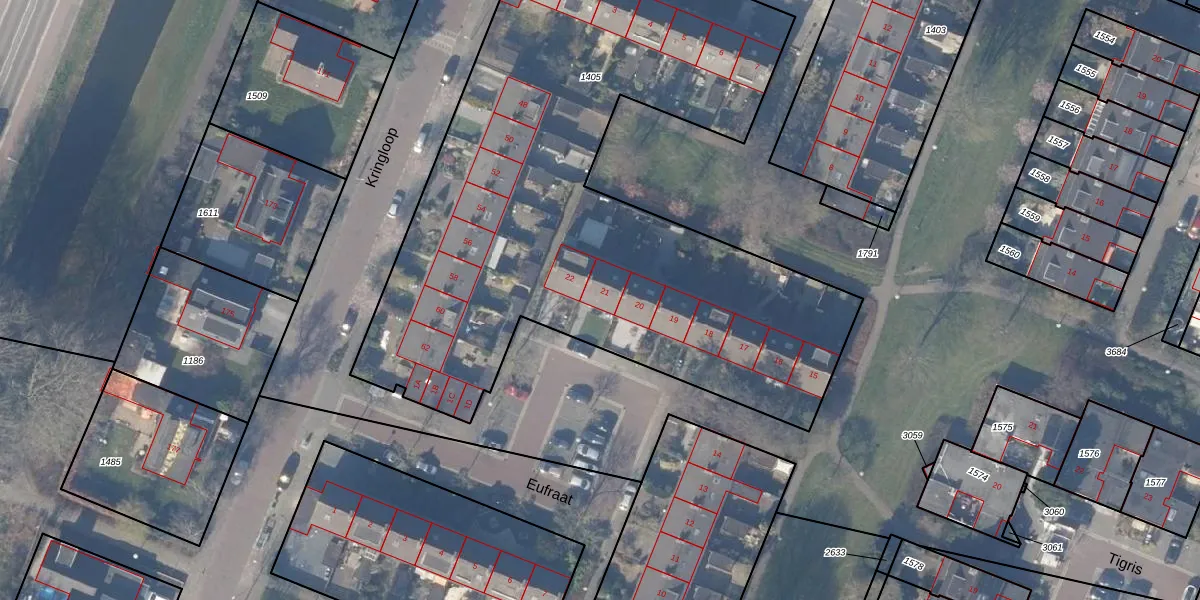 Het perceel waarop Eufraat 21 staat heeft een oppervlakte van 3692 m². Dit is een zeer groot perceel. De perceeloppervlakte wordt geregistreerd door het Kadaster. Gedetailleerde informatie over de maten van dit perceel kunt u vinden in het rapport Kadastrale kaart met maatvoering van Eufraat 21.