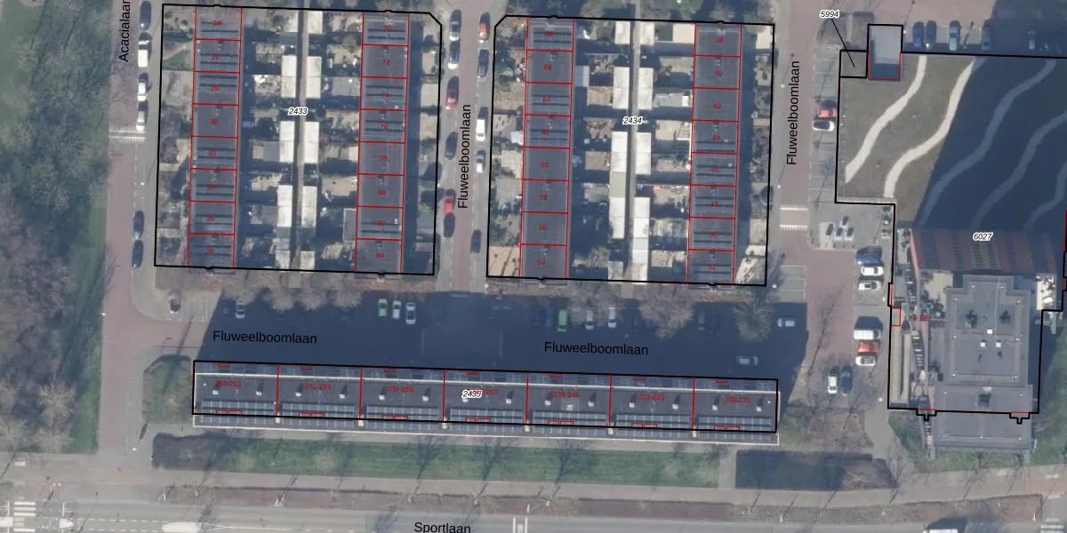 Het perceel waarop Fluweelboomlaan 54 staat heeft een oppervlakte van 2562 m². Dit is een zeer groot perceel. De perceeloppervlakte wordt geregistreerd door het Kadaster. Gedetailleerde informatie over de maten van dit perceel kunt u vinden in het rapport Kadastrale kaart met maatvoering van Fluweelboomlaan 54.