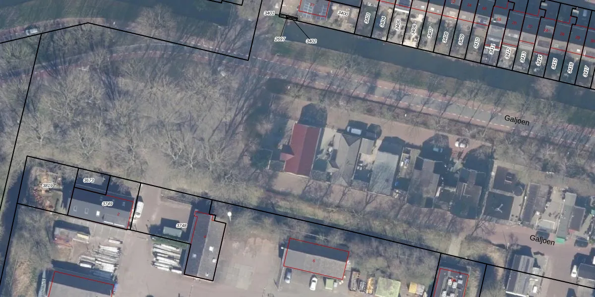 Het perceel waarop Galjoen 20 staat heeft een oppervlakte van 4,7 ha. Dit is een zeer groot perceel. De perceeloppervlakte wordt geregistreerd door het Kadaster. Gedetailleerde informatie over de maten van dit perceel kunt u vinden in het rapport Kadastrale kaart met maatvoering van Galjoen 20.