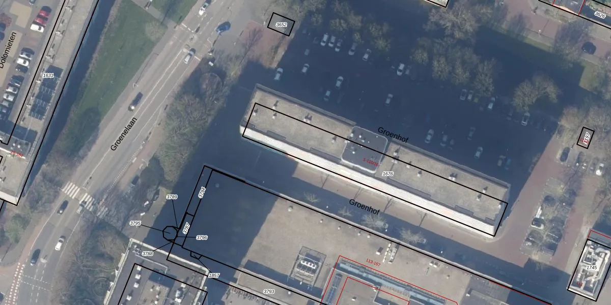 Het perceel waarop Groenhof 110-14 staat heeft een oppervlakte van 1037 m². Dit is een zeer groot perceel. De perceeloppervlakte wordt geregistreerd door het Kadaster. Gedetailleerde informatie over de maten van dit perceel kunt u vinden in het rapport Kadastrale kaart met maatvoering van Groenhof 110-14.