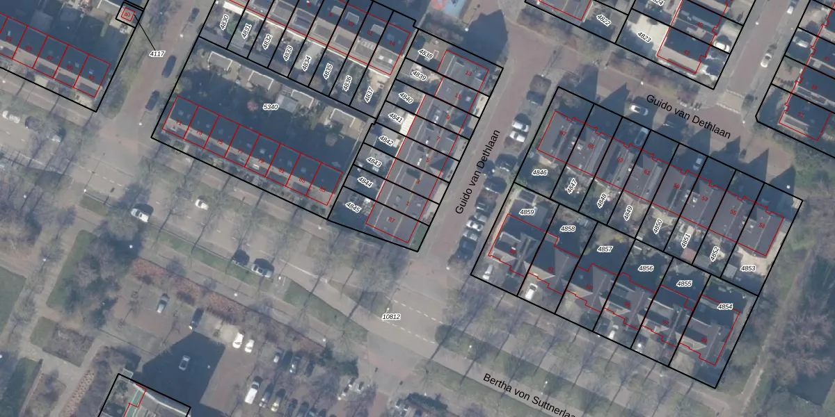 Guido van Dethlaan 1 is gelegen op kadastraal perceel ASV00O4844. Deze kadastrale aanduiding is uniek en wordt gebruikt door het Kadaster om eigendomsrechten en andere zakelijke rechten vast te leggen. Het perceel maakt onderdeel uit van de kadastrale gemeente Amstelveen.