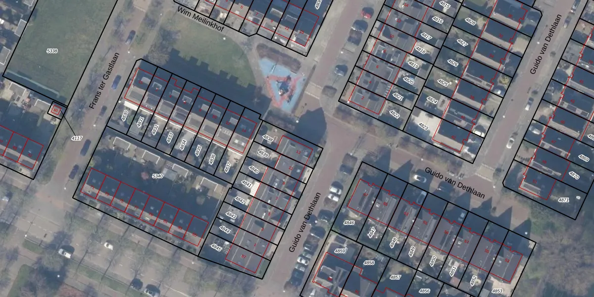 Het perceel waarop Guido van Dethlaan 13 staat heeft een oppervlakte van 176 m². Dit is een middelgroot perceel. De perceeloppervlakte wordt geregistreerd door het Kadaster. Gedetailleerde informatie over de maten van dit perceel kunt u vinden in het rapport Kadastrale kaart met maatvoering van Guido van Dethlaan 13.