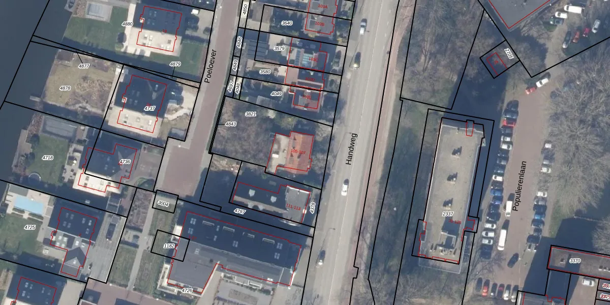 Handweg 105 is gelegen op kadastraal perceel ASV00G3821. Deze kadastrale aanduiding is uniek en wordt gebruikt door het Kadaster om eigendomsrechten en andere zakelijke rechten vast te leggen. Het perceel maakt onderdeel uit van de kadastrale gemeente Amstelveen.