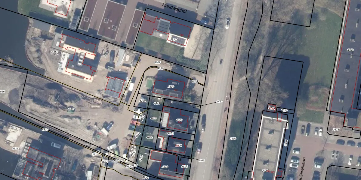 Het perceel waarop Handweg 121 staat heeft een oppervlakte van 478 m². Dit is een groot perceel. De perceeloppervlakte wordt geregistreerd door het Kadaster. Gedetailleerde informatie over de maten van dit perceel kunt u vinden in het rapport Kadastrale kaart met maatvoering van Handweg 121.
