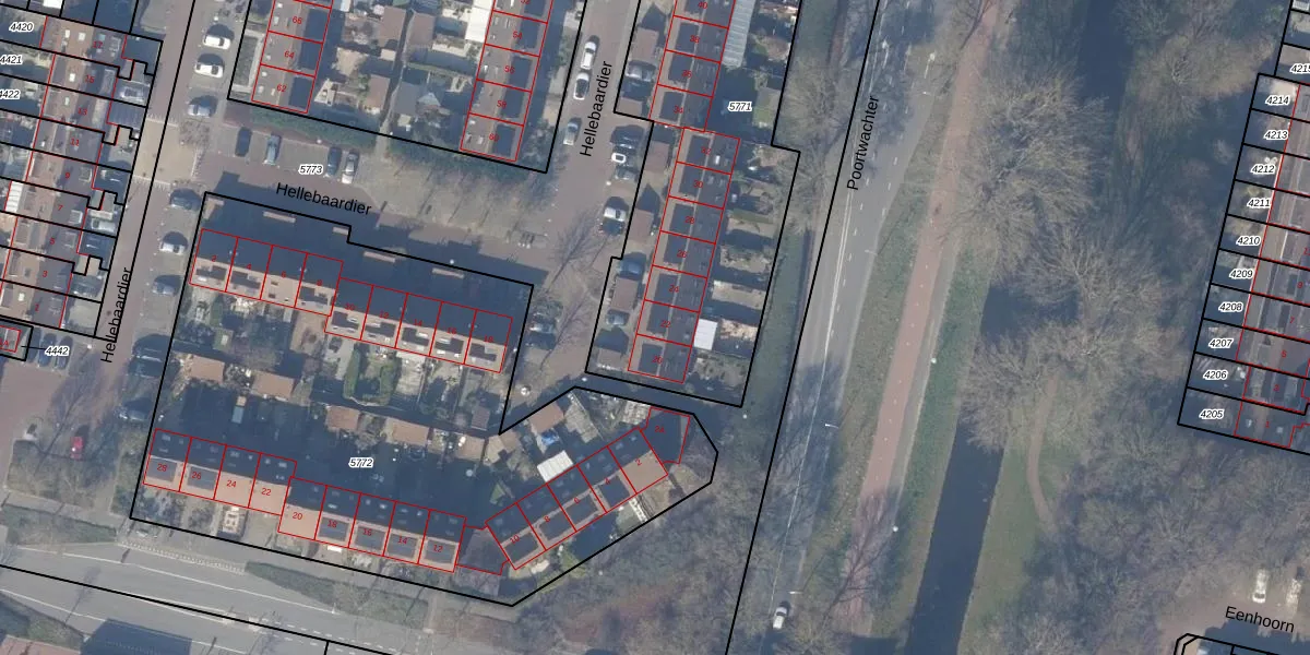 Het perceel waarop Hellebaardier 22 staat heeft een oppervlakte van 1774 m². Dit is een zeer groot perceel. De perceeloppervlakte wordt geregistreerd door het Kadaster. Gedetailleerde informatie over de maten van dit perceel kunt u vinden in het rapport Kadastrale kaart met maatvoering van Hellebaardier 22.