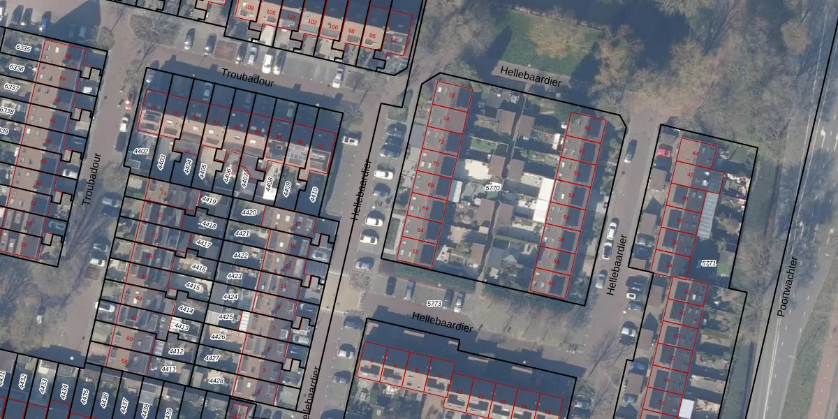 Het perceel waarop Hellebaardier 66 staat heeft een oppervlakte van 2294 m². Dit is een zeer groot perceel. De perceeloppervlakte wordt geregistreerd door het Kadaster. Gedetailleerde informatie over de maten van dit perceel kunt u vinden in het rapport Kadastrale kaart met maatvoering van Hellebaardier 66.