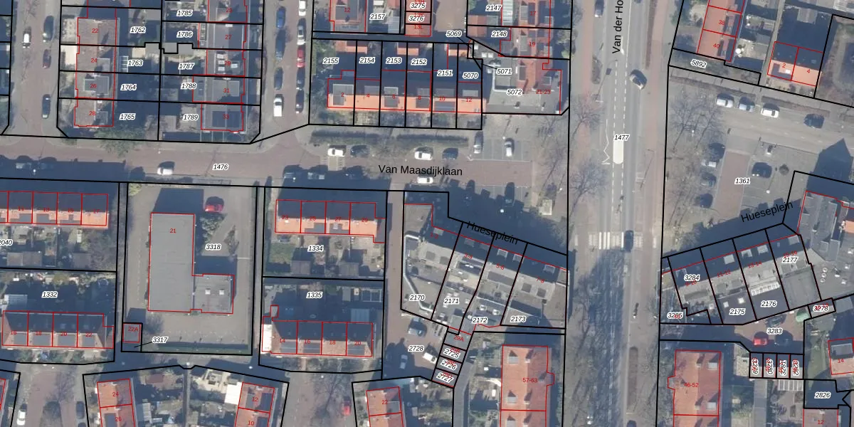 Het perceel waarop Hueseplein 1 staat heeft een oppervlakte van 322 m². Dit is een groot perceel. De perceeloppervlakte wordt geregistreerd door het Kadaster. Gedetailleerde informatie over de maten van dit perceel kunt u vinden in het rapport Kadastrale kaart met maatvoering van Hueseplein 1.
