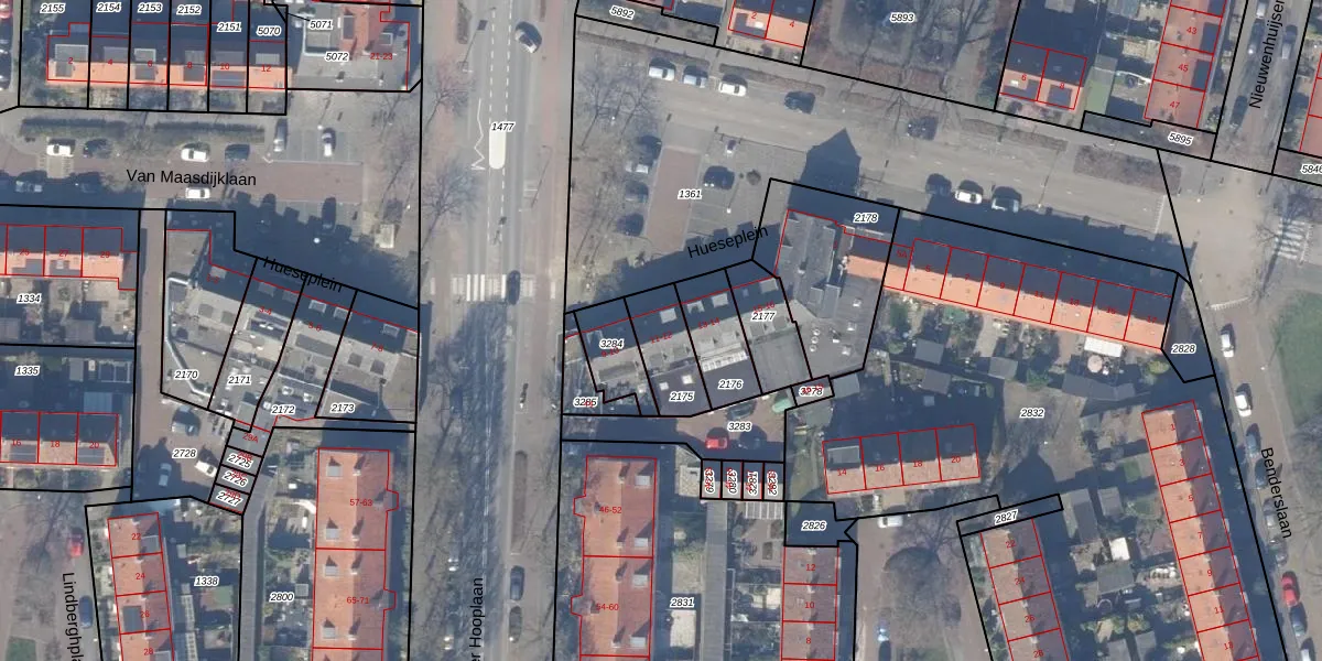 Het perceel waarop Hueseplein 12 staat heeft een oppervlakte van 153 m². Dit is een middelgroot perceel. De perceeloppervlakte wordt geregistreerd door het Kadaster. Gedetailleerde informatie over de maten van dit perceel kunt u vinden in het rapport Kadastrale kaart met maatvoering van Hueseplein 12.