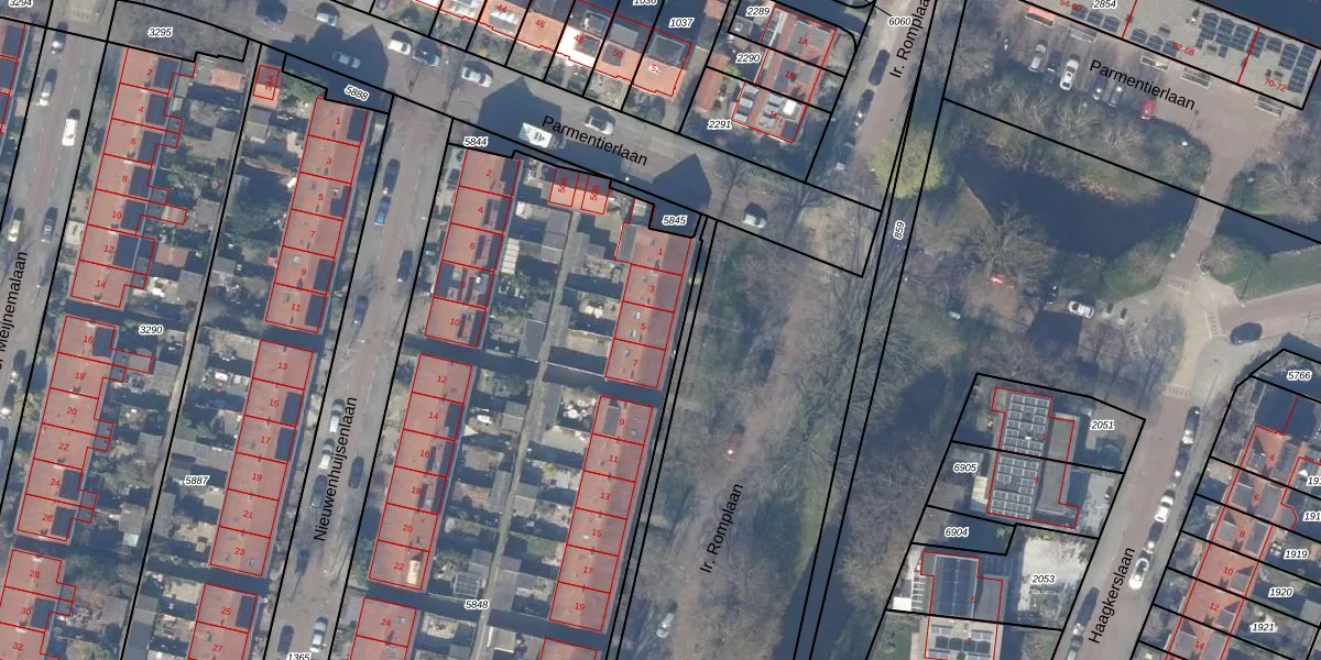 Het perceel waarop Ir. Romplaan 5 staat heeft een oppervlakte van 6493 m². Dit is een zeer groot perceel. De perceeloppervlakte wordt geregistreerd door het Kadaster. Gedetailleerde informatie over de maten van dit perceel kunt u vinden in het rapport Kadastrale kaart met maatvoering van Ir. Romplaan 5.