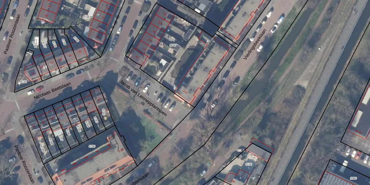 Het perceel waarop het adres ligt is ASV00-O-8695. De afkorting 'ASV00' staat voor kadastrale gemeente Amstelveen. Het perceel is met 1747 m² relatief groot. Het gemiddelde ligt in de kadastrale gemeente Amstelveen op 1598,72 m². De grootste perceeloppervlakte in de kadastrale gemeente is 1,78 km². De kleinste oppervlakte bedraagt 0 m². Er zijn 22 adressen aanwezig op het perceel. In de Basisregistratie Kadaster (BRK) werden de grenzen van het perceel geregistreerd op 31-10-2011.