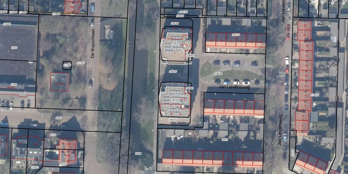 Jan Lievensweg 21-A is gelegen op kadastraal perceel ASV00H18036. Deze kadastrale aanduiding is uniek en wordt gebruikt door het Kadaster om eigendomsrechten en andere zakelijke rechten vast te leggen. Het perceel maakt onderdeel uit van de kadastrale gemeente Amstelveen.