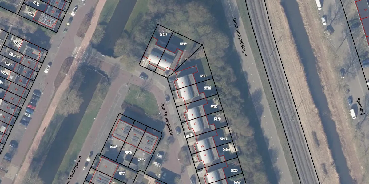 Jan Teulingslaan 7 is gelegen op kadastraal perceel ASV00O7361. Deze kadastrale aanduiding is uniek en wordt gebruikt door het Kadaster om eigendomsrechten en andere zakelijke rechten vast te leggen. Het perceel maakt onderdeel uit van de kadastrale gemeente Amstelveen.
