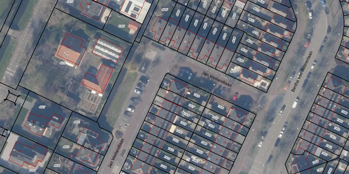 Jan Weilandlaan 1 is gelegen op kadastraal perceel ASV00O7426. Deze kadastrale aanduiding is uniek en wordt gebruikt door het Kadaster om eigendomsrechten en andere zakelijke rechten vast te leggen. Het perceel maakt onderdeel uit van de kadastrale gemeente Amstelveen.