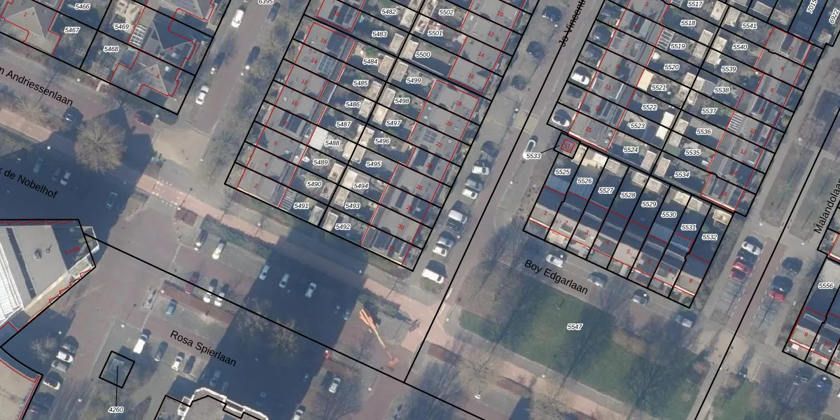Het perceel waarop het adres ligt is ASV00-O-5494. De afkorting 'ASV00' staat voor kadastrale gemeente Amstelveen. De gemiddelde perceelgrootte in Amstelveen is 1598,78 m². Dit perceel is kleiner: de perceeloppervlakte bedraagt 133 m². Het kleinste perceel in de kadastrale gemeente is 0 m² groot. De grootste perceeloppervlakte is 1,78 km². Op het perceel bevinden zich geen andere adressen. De huidige grenzen van het perceel zijn digitaal in de Basisregistratie Kadaster (BRK) geregistreerd op 08-03-2001.