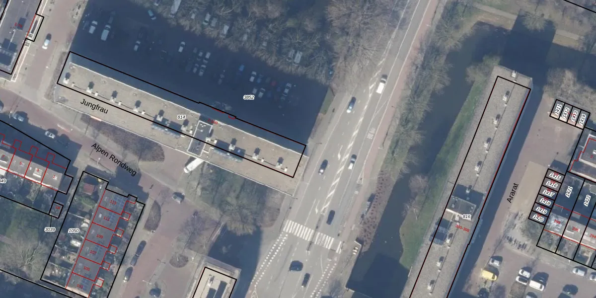 Het perceel waarop Jungfrau 2-B staat heeft een oppervlakte van 973 m². Dit is een groot perceel. De perceeloppervlakte wordt geregistreerd door het Kadaster. Gedetailleerde informatie over de maten van dit perceel kunt u vinden in het rapport Kadastrale kaart met maatvoering van Jungfrau 2-B.