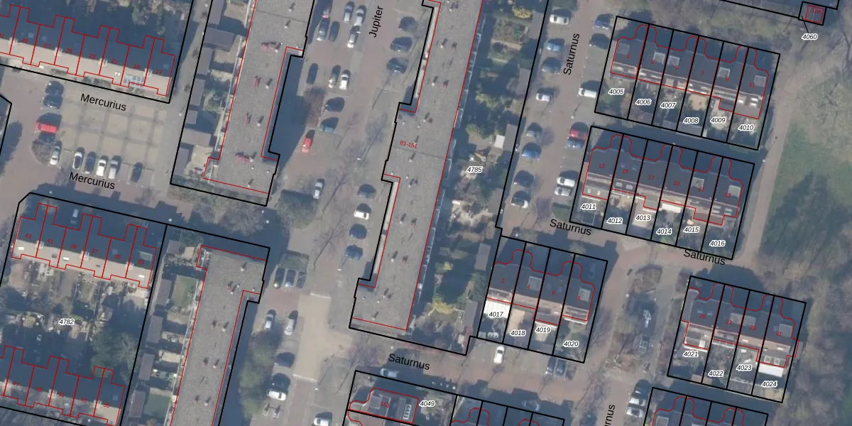 Het perceel waarop Jupiter 141 staat heeft een oppervlakte van 2430 m². Dit is een zeer groot perceel. De perceeloppervlakte wordt geregistreerd door het Kadaster. Gedetailleerde informatie over de maten van dit perceel kunt u vinden in het rapport Kadastrale kaart met maatvoering van Jupiter 141.
