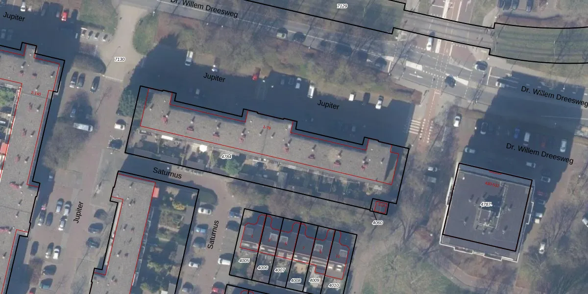 Het perceel waarop Jupiter 55 staat heeft een oppervlakte van 2050 m². Dit is een zeer groot perceel. De perceeloppervlakte wordt geregistreerd door het Kadaster. Gedetailleerde informatie over de maten van dit perceel kunt u vinden in het rapport Kadastrale kaart met maatvoering van Jupiter 55.