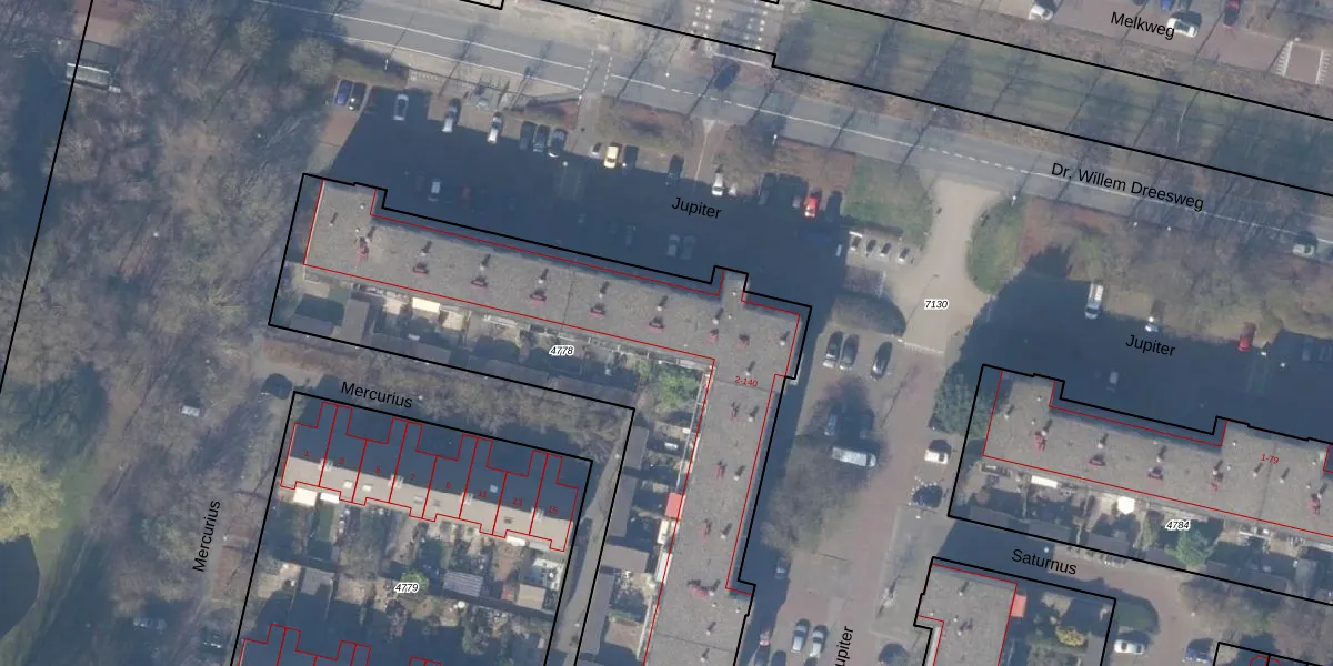Het perceel waarop Jupiter 56 staat heeft een oppervlakte van 3354 m². Dit is een zeer groot perceel. De perceeloppervlakte wordt geregistreerd door het Kadaster. Gedetailleerde informatie over de maten van dit perceel kunt u vinden in het rapport Kadastrale kaart met maatvoering van Jupiter 56.
