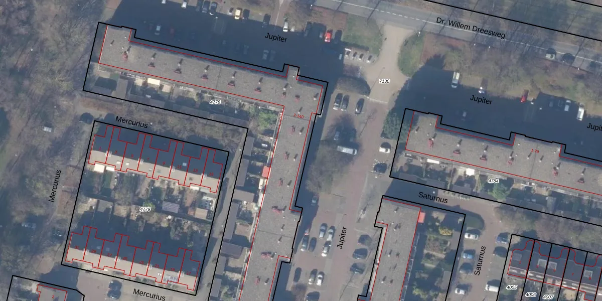 Het perceel waarop Jupiter 70 staat heeft een oppervlakte van 3354 m². Dit is een zeer groot perceel. De perceeloppervlakte wordt geregistreerd door het Kadaster. Gedetailleerde informatie over de maten van dit perceel kunt u vinden in het rapport Kadastrale kaart met maatvoering van Jupiter 70.