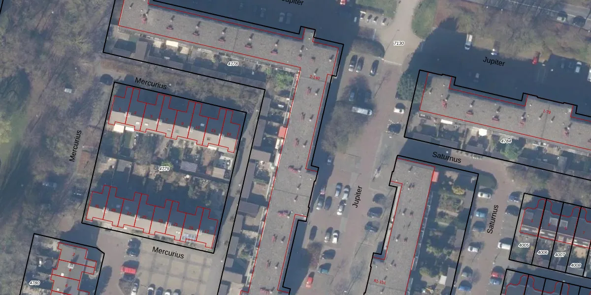 Het perceel waarop Jupiter 94 staat heeft een oppervlakte van 3354 m². Dit is een zeer groot perceel. De perceeloppervlakte wordt geregistreerd door het Kadaster. Gedetailleerde informatie over de maten van dit perceel kunt u vinden in het rapport Kadastrale kaart met maatvoering van Jupiter 94.