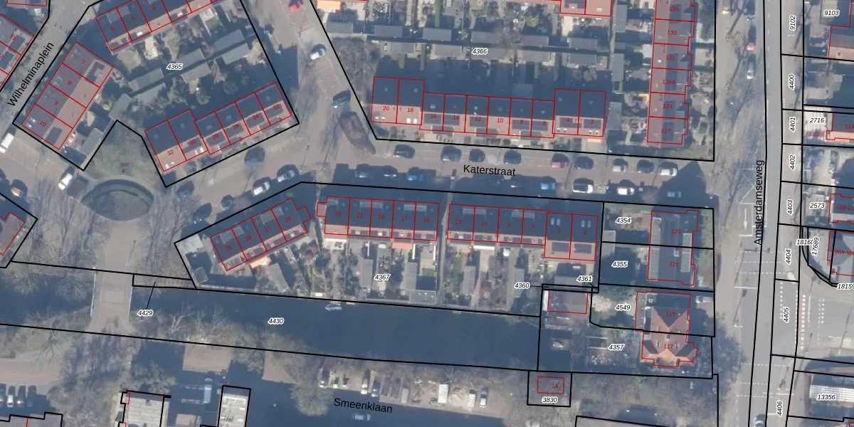 Katerstraat 15 is gelegen op kadastraal perceel ASV00G4367. Deze kadastrale aanduiding is uniek en wordt gebruikt door het Kadaster om eigendomsrechten en andere zakelijke rechten vast te leggen. Het perceel maakt onderdeel uit van de kadastrale gemeente Amstelveen.