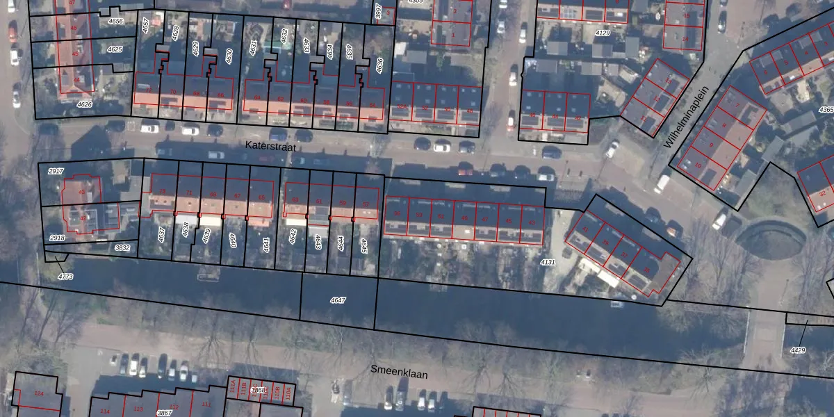 Katerstraat 53 is gelegen op kadastraal perceel ASV00G4131. Deze kadastrale aanduiding is uniek en wordt gebruikt door het Kadaster om eigendomsrechten en andere zakelijke rechten vast te leggen. Het perceel maakt onderdeel uit van de kadastrale gemeente Amstelveen.