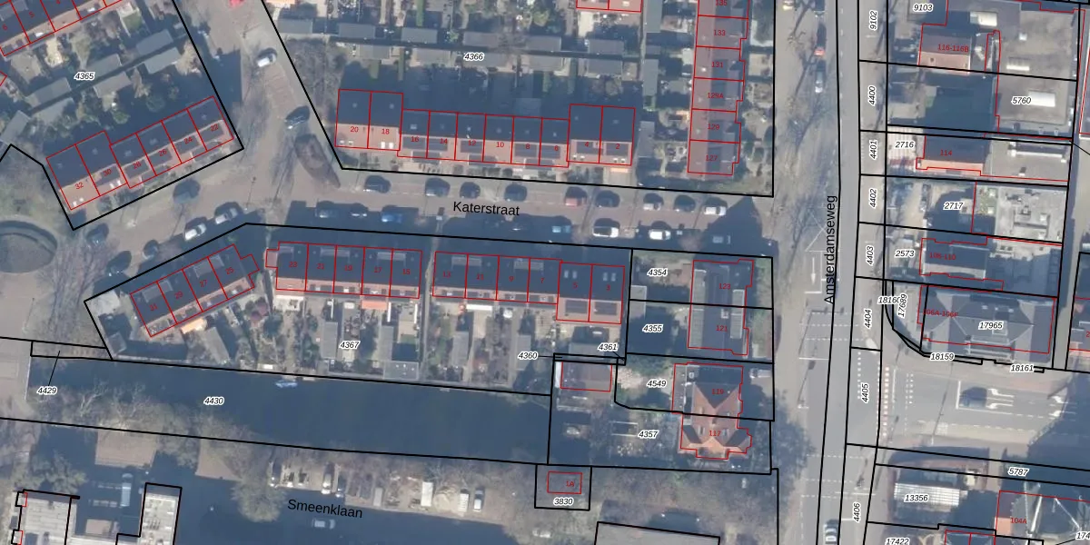 Katerstraat 7 is gelegen op kadastraal perceel ASV00G4367. Deze kadastrale aanduiding is uniek en wordt gebruikt door het Kadaster om eigendomsrechten en andere zakelijke rechten vast te leggen. Het perceel maakt onderdeel uit van de kadastrale gemeente Amstelveen.