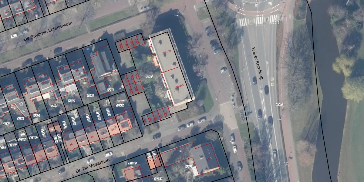 Het perceel waarop Keizer Karelweg 269 staat heeft een oppervlakte van 1280 m². Dit is een zeer groot perceel. De perceeloppervlakte wordt geregistreerd door het Kadaster. Gedetailleerde informatie over de maten van dit perceel kunt u vinden in het rapport Kadastrale kaart met maatvoering van Keizer Karelweg 269.