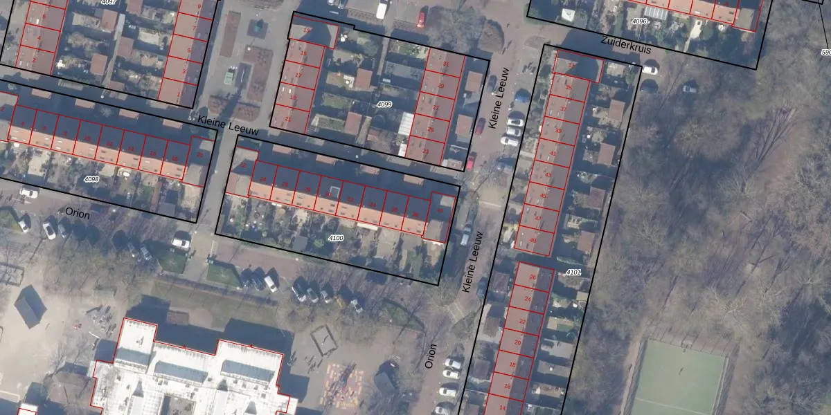 Kleine Leeuw 38 is gelegen op kadastraal perceel ASV00M4100. Deze kadastrale aanduiding is uniek en wordt gebruikt door het Kadaster om eigendomsrechten en andere zakelijke rechten vast te leggen. Het perceel maakt onderdeel uit van de kadastrale gemeente Amstelveen.