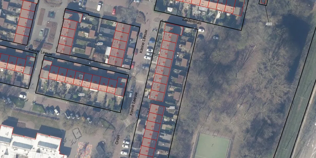 Kleine Leeuw 45 is gelegen op kadastraal perceel ASV00M4101. Deze kadastrale aanduiding is uniek en wordt gebruikt door het Kadaster om eigendomsrechten en andere zakelijke rechten vast te leggen. Het perceel maakt onderdeel uit van de kadastrale gemeente Amstelveen.