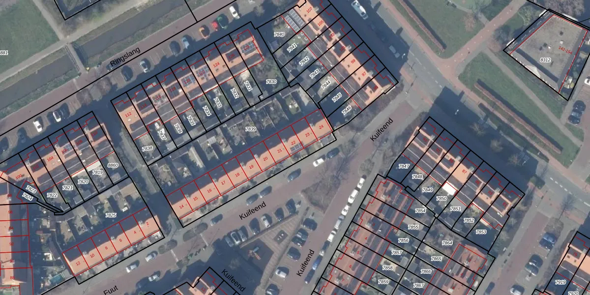 Het perceel waarop Kuifeend 22 staat heeft een oppervlakte van 1435 m². Dit is een zeer groot perceel. De perceeloppervlakte wordt geregistreerd door het Kadaster. Gedetailleerde informatie over de maten van dit perceel kunt u vinden in het rapport Kadastrale kaart met maatvoering van Kuifeend 22.